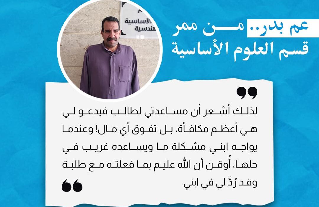 كما هو الحال.. كل صباحٍ يعجُّ المبنى بحركة الطلبة وتوافد الأساتذة وأصواتهم المُتداخلة، ثم تلحظ خطواتٍ هادئة ومتناغمة مع هذا الصخب، يصحبها تصاعد أبخرة الشاي وحركة الكثير من الأوراق بدقةٍ من مكتبٍ لأخر بيد رجلٍ بسيط يحفظ كل تلك الممرات عن ظهر قلب، يُضيف لكل موقفٍ بصمته فيُرشد طالبًا ويُحوِّل ارتباكه إلى طمأنينة، ينصح معيدًا بعصارة ما أكسبته السنوات ويُذكِّر أستاذًا بأمرٍ غفل عنه! إنه “عم بدر”.