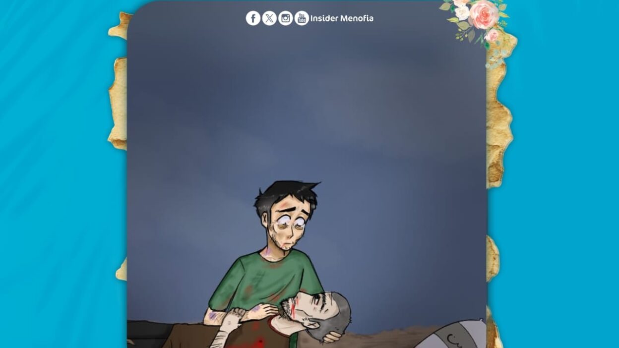التقط الأب كيس واحتضنه بشدة.. اختل توازنه أثر اندفاع المجوَّعين، وقع فداس عليه المارة! سحبه ابنه بكل قوته، يقوم.. يستجمع قوته يحتضن الكيس كأنه وجد ابنًا ضائعًا، يخرجون من تل الرمال بعد معاناة؛ لكن يعود القصف مجددًا، تستهدف رصاصة قلب الأب فيسقط رغمًا عنه، يُبعد كيس الطحين عن نزيف دمه، يصرخ في وجه ابنه ويُحلفه: “خُذ الطحين وارجع لإخواتك يا قلب البابا”.